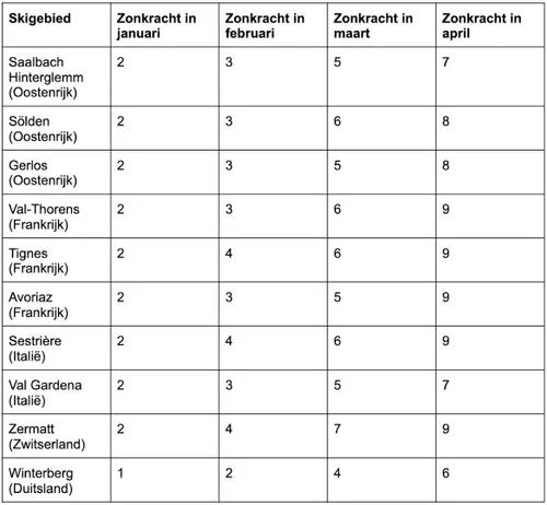De onderstaande tabel laat de gemiddelde zonkracht zien in tien van de meest bezochte skigebieden door Nederlanders: