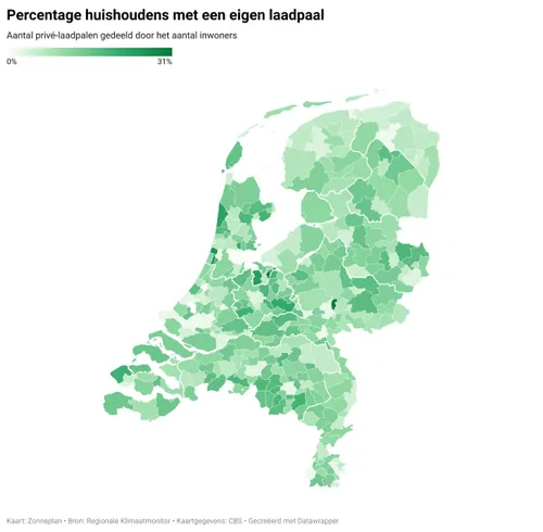 In Noord-Brabant zijn het met name inwoners van Heeze-Leende die veel van een eigen laadfaciliteit gebruikmaken. Maar liefst 18 procent van alle woningen in deze gemeente heeft een eigen laadpaal. Ook onder meer Eersel, Alphen-Chaam, Hilvarenbeek en Sint-Michielsgestel scoren ruim boven het landelijk gemiddelde van 8 procent. De steden Eindhoven en Tilburg - waar men logischerwijs minder vaak over een eigen oprit beschikt - zitten hier juist ver onder.